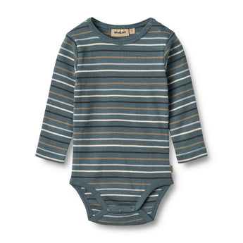Langærmet body Freddie med striber i blødt økologisk bomuld til din baby. Wheats basis body er en sand klassiker i garderoben, når det kommer til småbørn. Denne body har trykknapper på den ene skulder samt i bunden for bedre komfort, når du skal klæde dit barn på. Brug bodyen som den inderste del i ethvert outfit, da den er blød at have tæt på huden. Du kan style bodyen afhængigt af vejr og årstid ved blandt andet at bruge den under et par smækbukser, leggings/bukser eller på kølige dage med en sweater/strik udover.