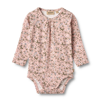 Langærmet body Liv med blomsterprint i blødt økologisk bomuld til din baby. Wheats basis body er en sand klassiker i garderoben, når det kommer til småbørn. Denne body har trykknapper på den ene skulder samt i bunden for bedre komfort, når du skal klæde dit barn på. Brug bodyen som den inderste del i ethvert outfit, da den er blød at have tæt på huden. Man kan style bodyen afhængigt af vejr og årstid ved blandt andet at bruge den under en kjole, til et par matchende leggings eller på kølige dage med en sweater/strik udover.