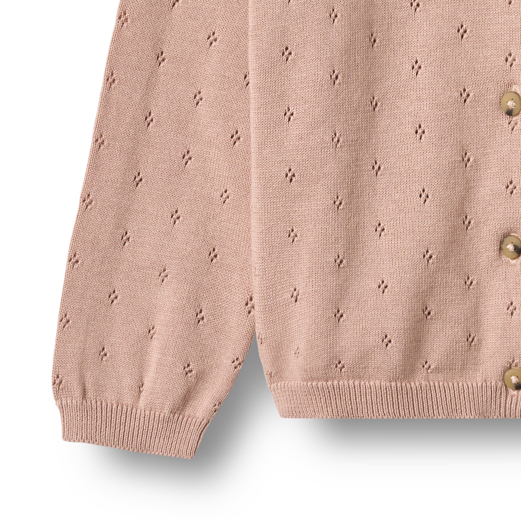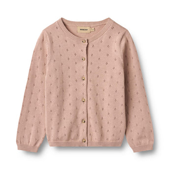 Cardiganen er fremstillet i ren økologisk bomuld, der føles behagelig mod huden og giver varme uden at fornemme en snert af krads. Den har knaplukning foran og ribkant ved hals, ærmer og nederste kant, som sikrer en god pasform og et klassisk udtryk. Den lette strikkvalitet og den fine rosa nuance gør den nem at style - både over kjoler, bluser og t-shirts alt efter vind og vejr.