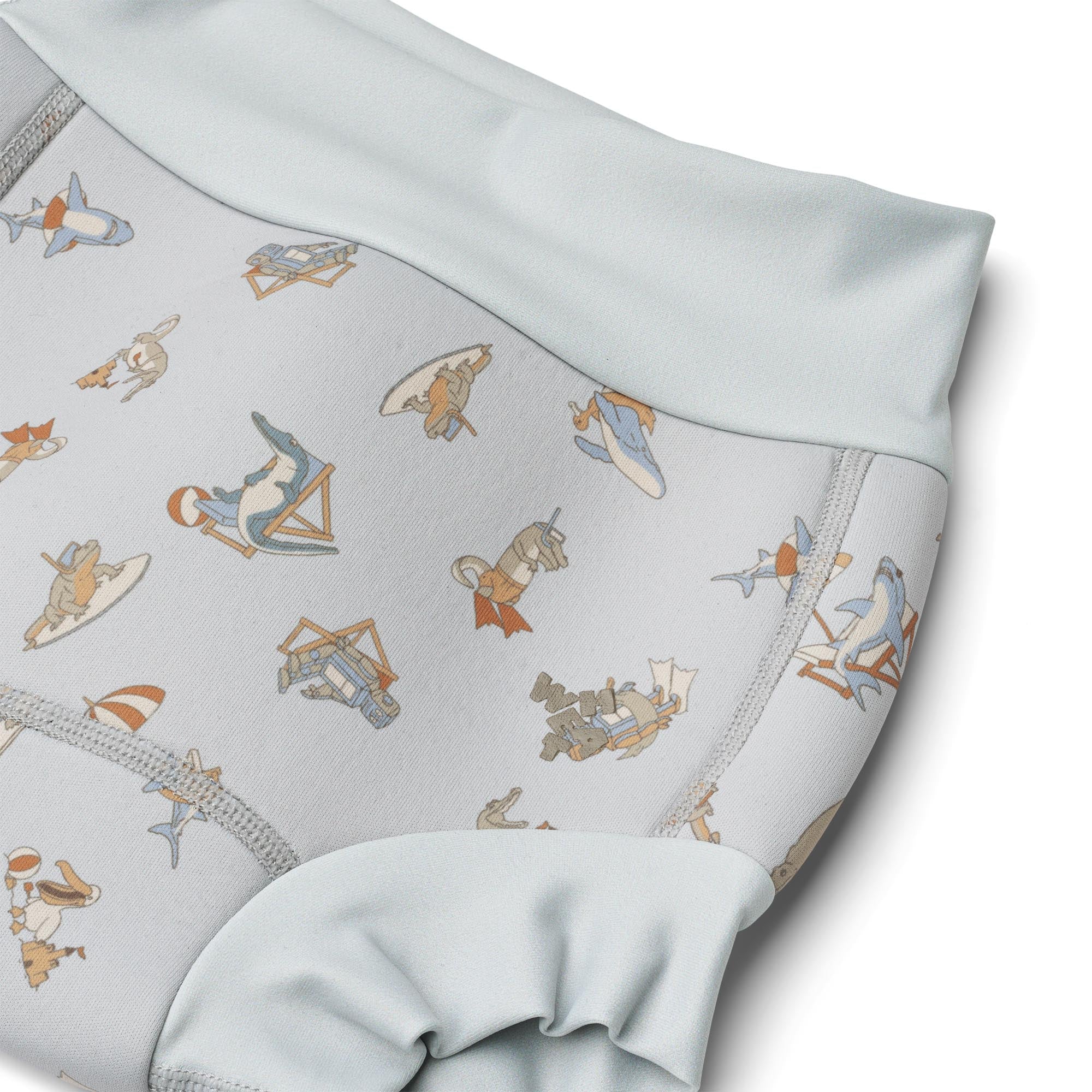 Disse uundværlige badebukser i farven "swim club" har en tæt pasform med en bred kant i taljen og i lårene, der sikrer, at de sidder tæt til din babys krop. Som flot detalje et fint print.