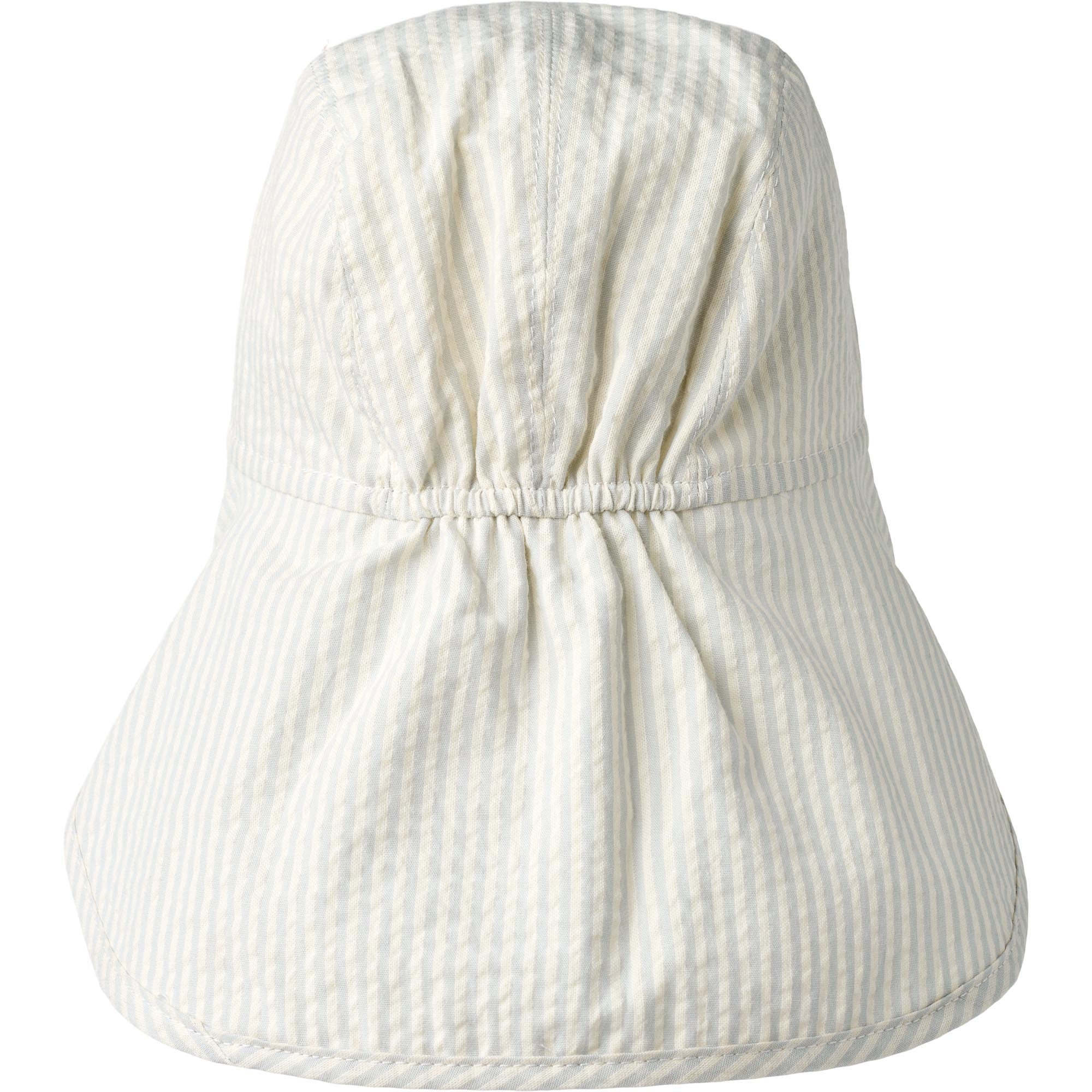 Denne dejlige legionærhat i skønne "blege" lyseblå og hvide striber ("blue summer stripe") har en en lang skygge, der dækker nakken, og en kort skygge, der dækker det meste af ansigtet og sørger for skygge til øjnene. Elastik i nakken sikrer en god pasform, og bindebåndene holder den godt på plads.