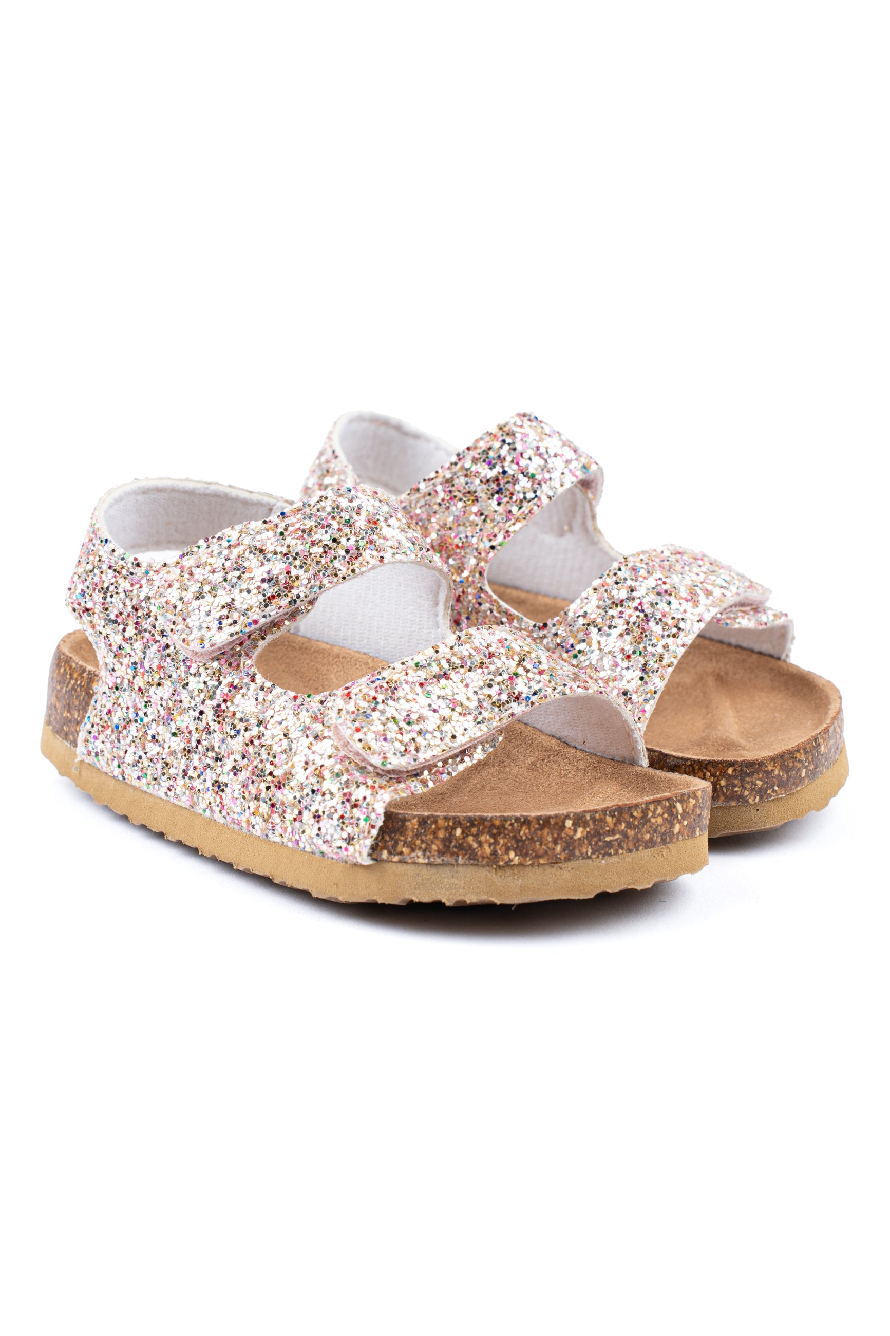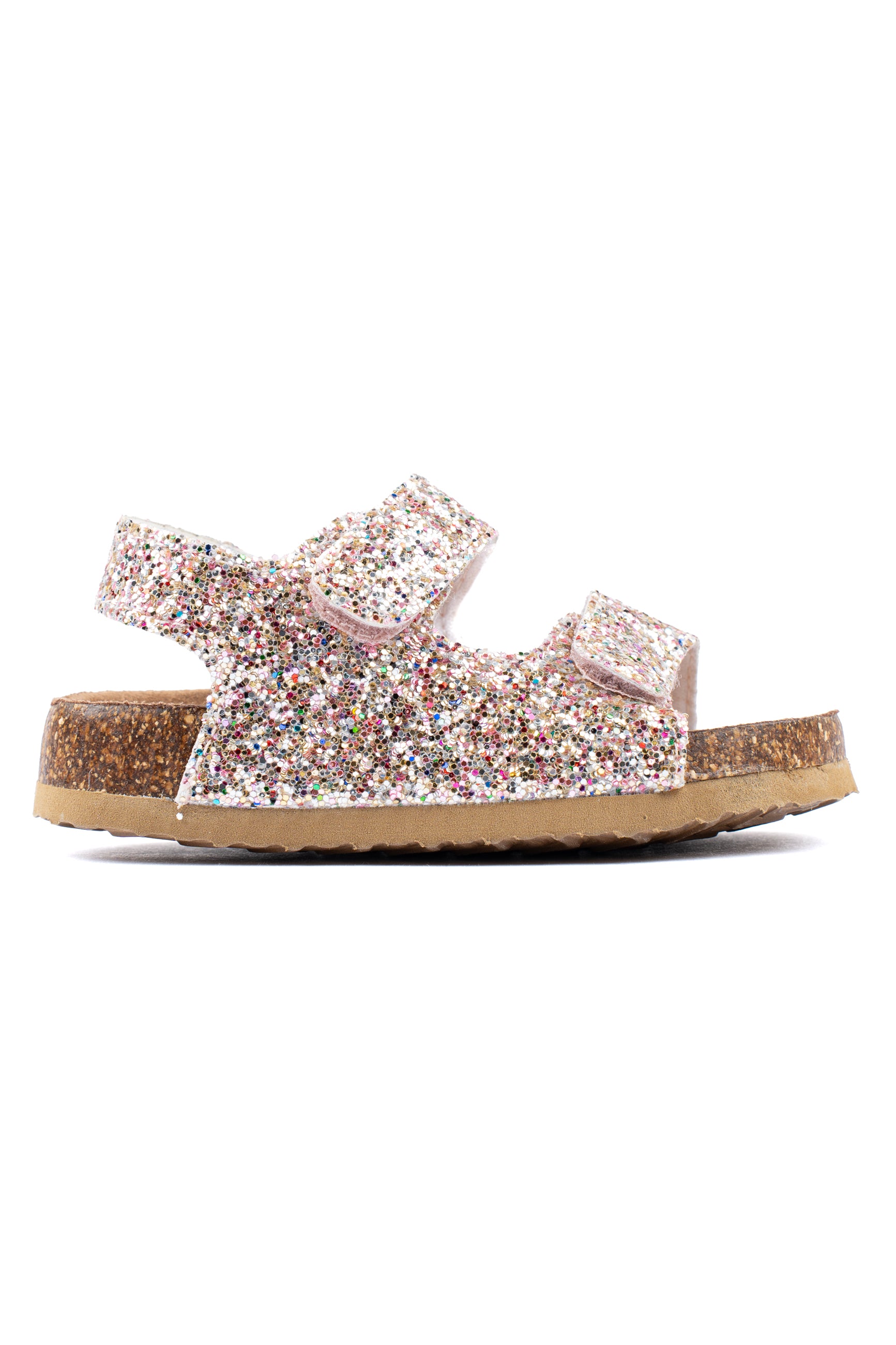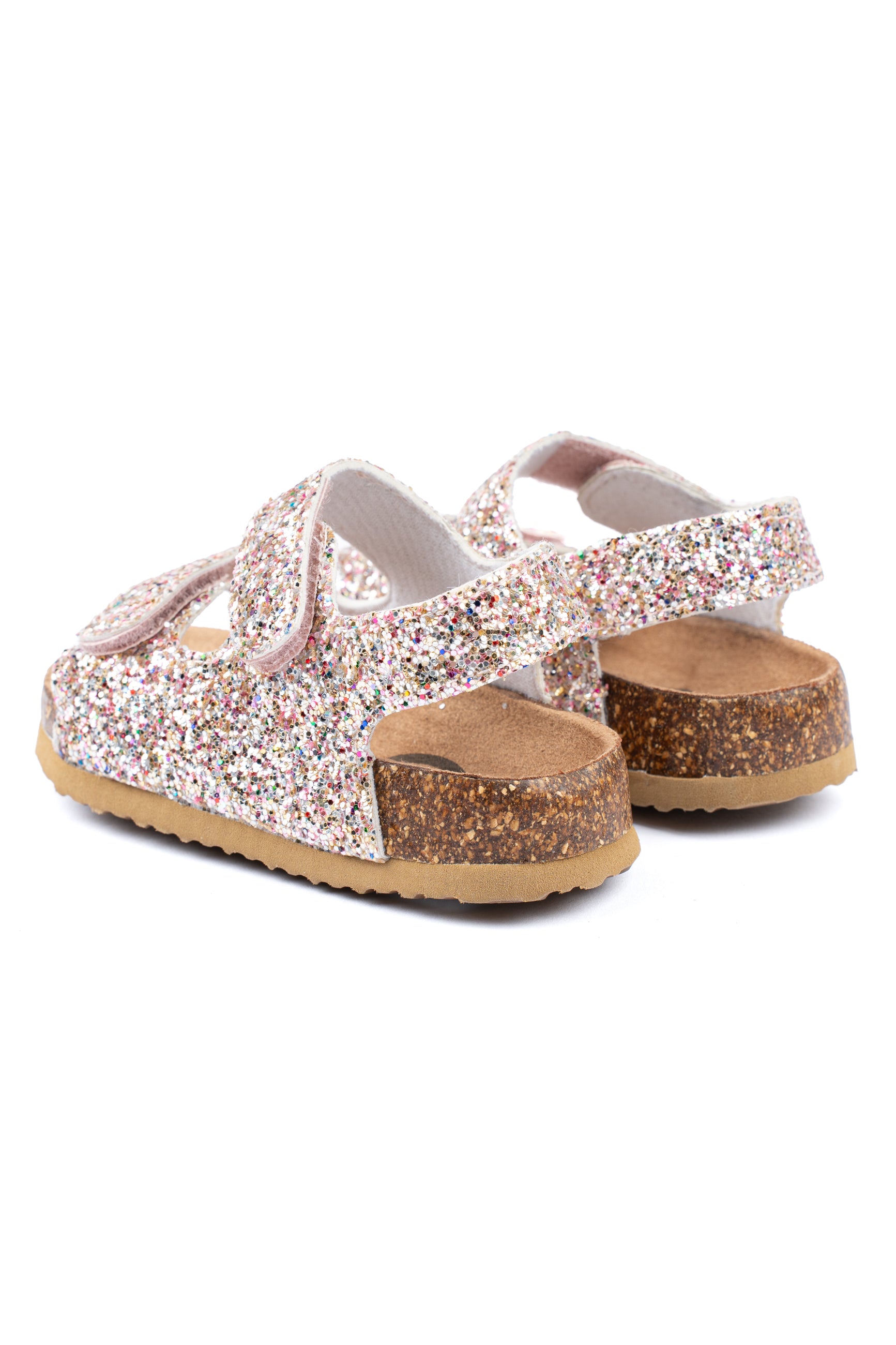 Lad dit barn skinne om kap med sommersolen med disse skønne sommersandaler! Glitter-sandalen er den perfekte måde at peppe ethvert barns sommeroutfit op på. Sandalen kommer med korkbund, EVA-såler og solide Velcro-lukninger ved begge stropper henover foden, som sammen sikrer god komfort.
