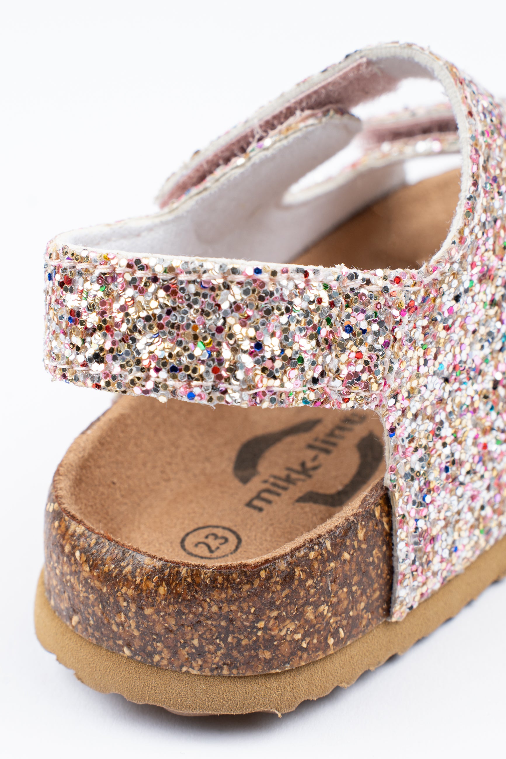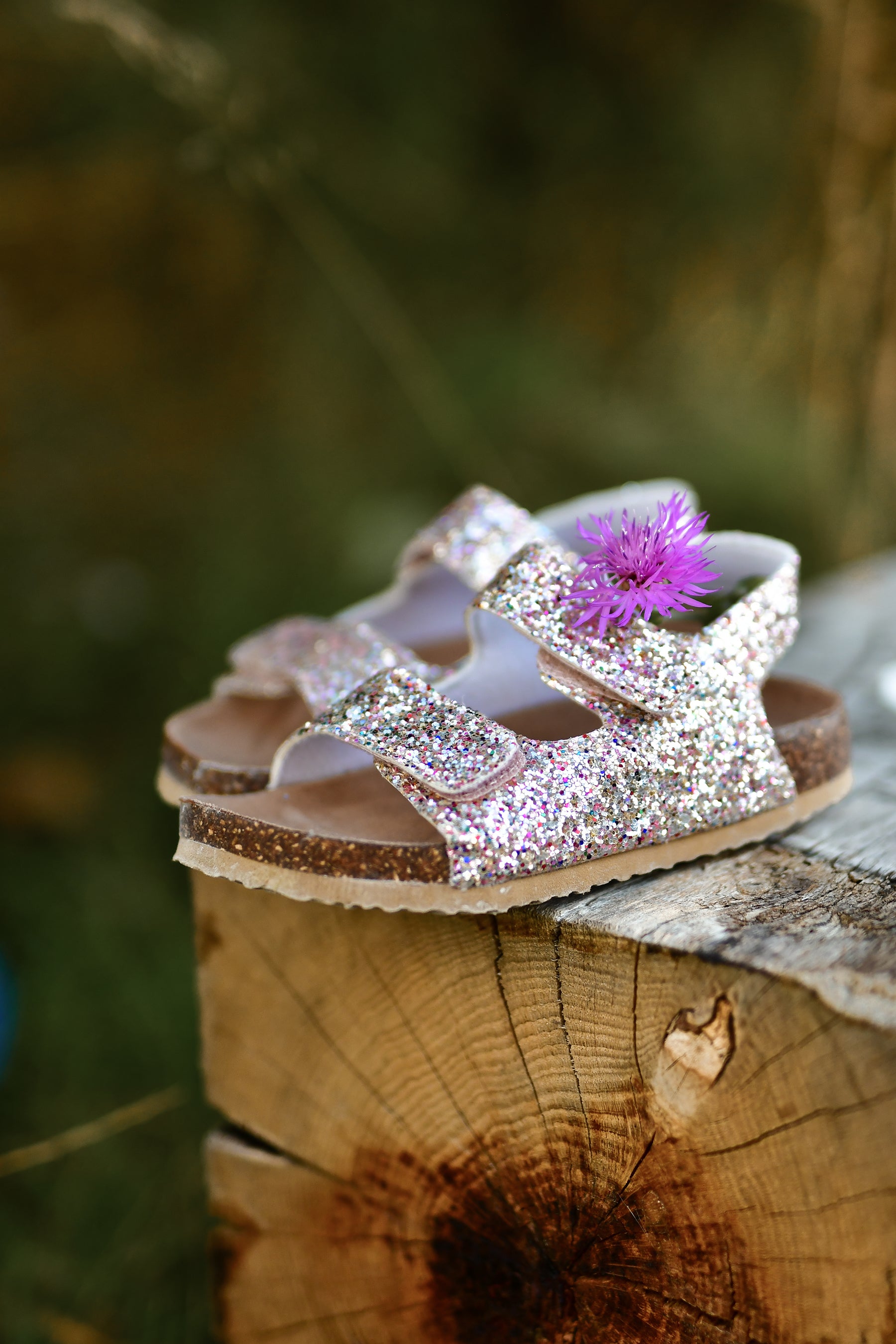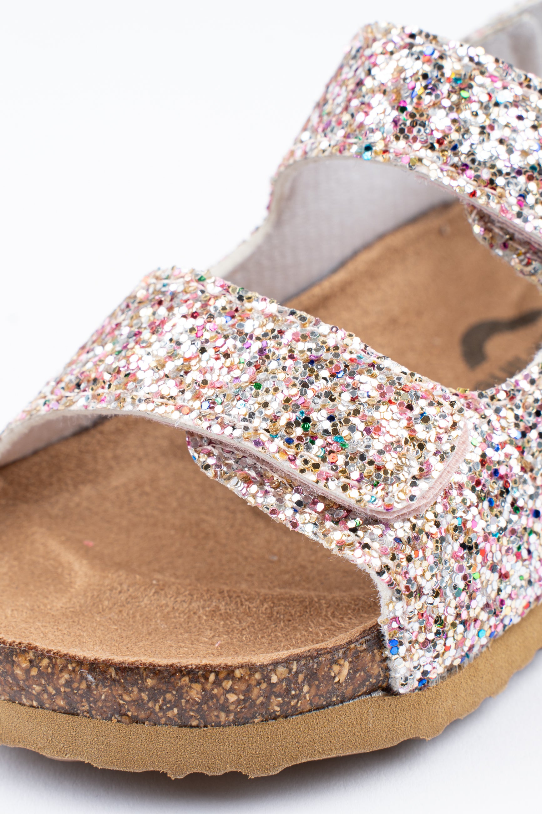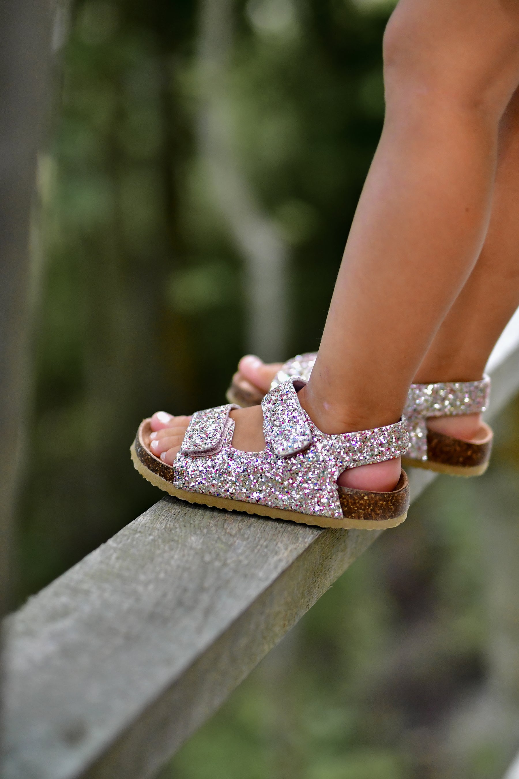 Lad dit barn skinne om kap med sommersolen med disse skønne sommersandaler! Glitter-sandalen er den perfekte måde at peppe ethvert barns sommeroutfit op på. Sandalen kommer med korkbund, EVA-såler og solide Velcro-lukninger ved begge stropper henover foden, som sammen sikrer god komfort.