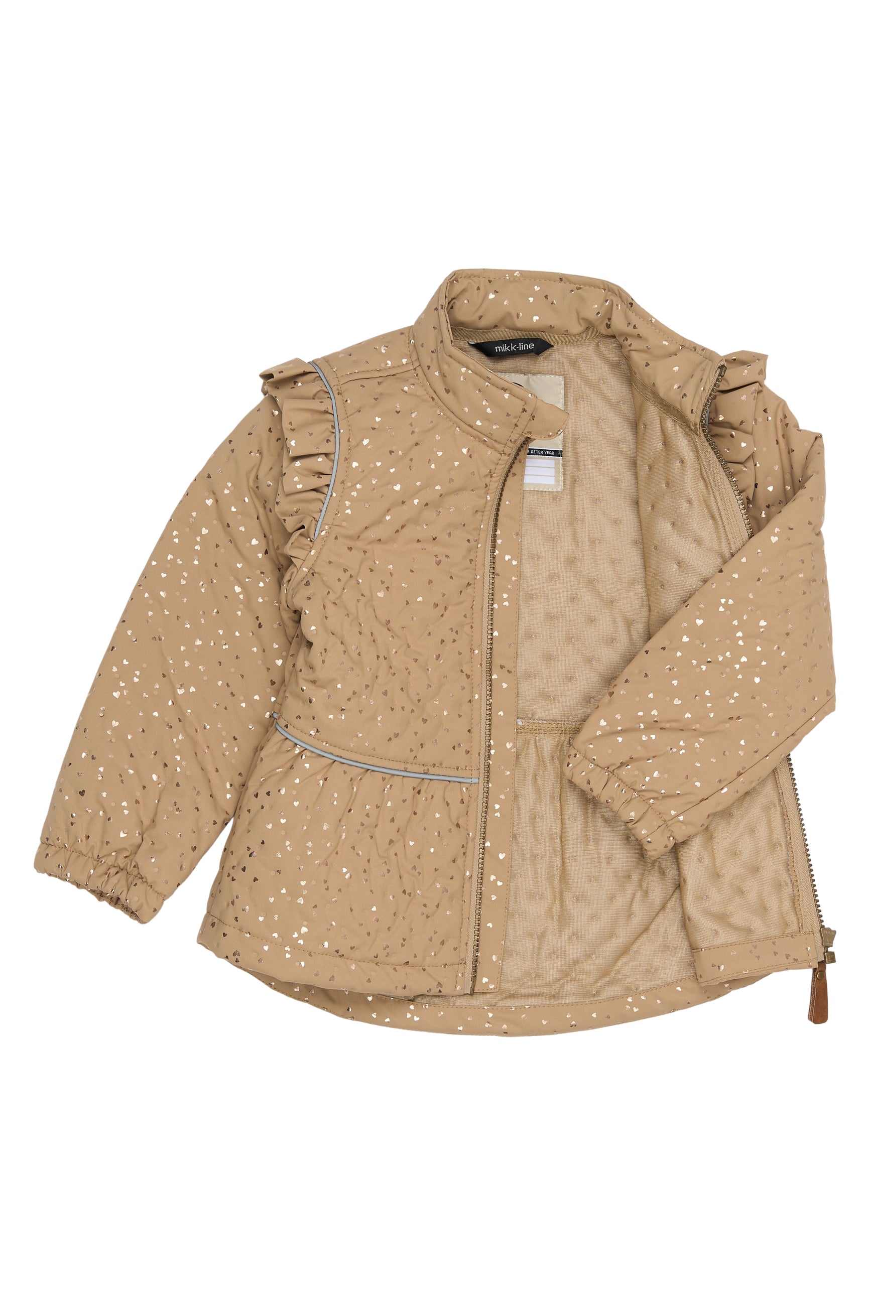 Dette smukke termosæt fra Mikk-Line i farven Kelp kombinerer funktionalitet med et fint og legende udtryk takket være de små guldhjerter overalt. Perfekt til overgangsperioder, hvor barnet har brug for varme og bevægelsesfrihed.