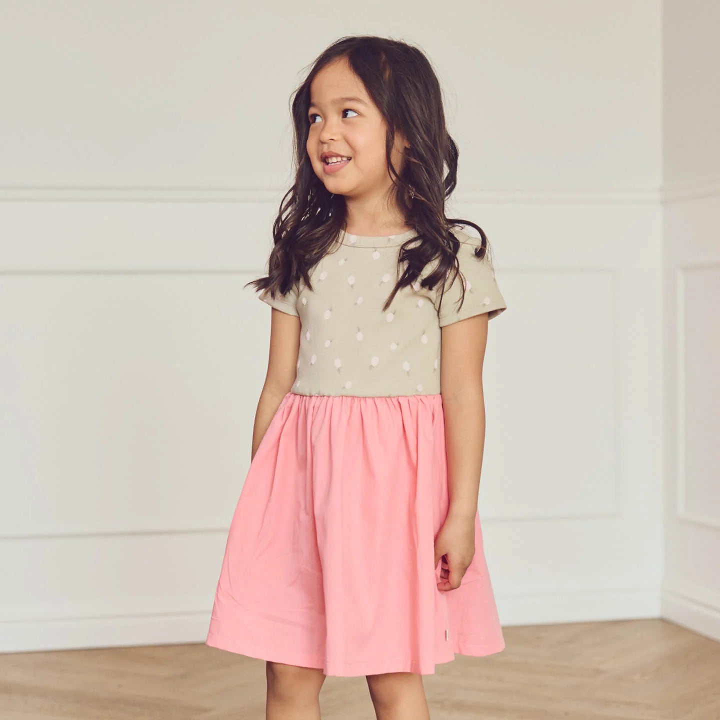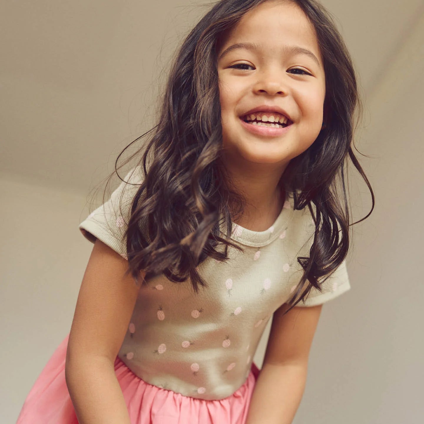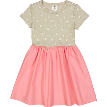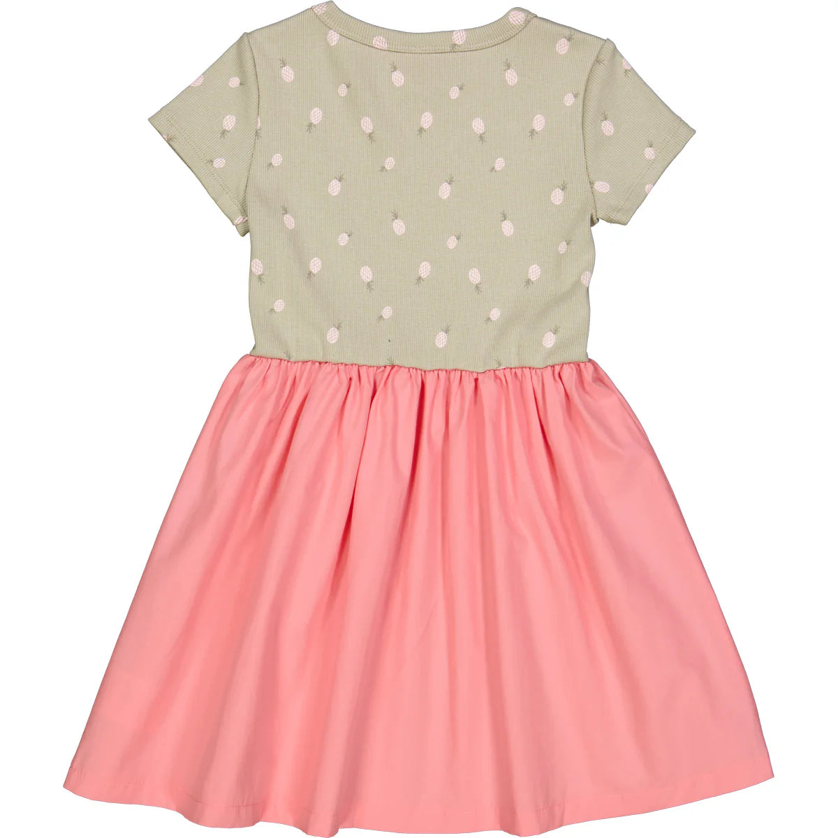 Så er der ananas i egen juice med denne søde kjole med små lyserøde ananasser! Kjolen kommer i en sart grøn nuance og en diskret ribstruktur og et skønt lyserød skørt.