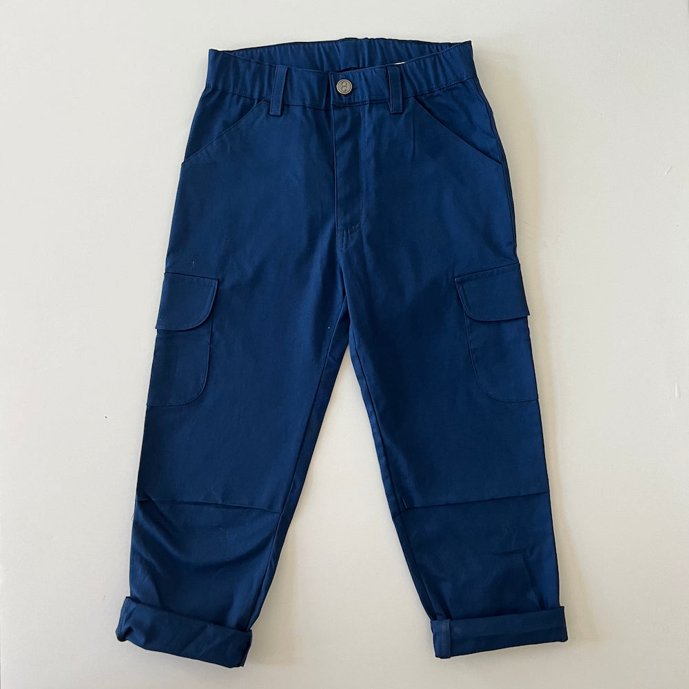 Disse cargobukser fra Okker Gokker i den klassiske farve Navy Blue er både praktiske og stilfulde – et oplagt valg til hverdagen. Bukserne er lavet i en blød og slidstærk twillkvalitet bestående af 97% økologisk bomuld og 3% spandex, som sikrer høj komfort og god bevægelighed for aktive børn.