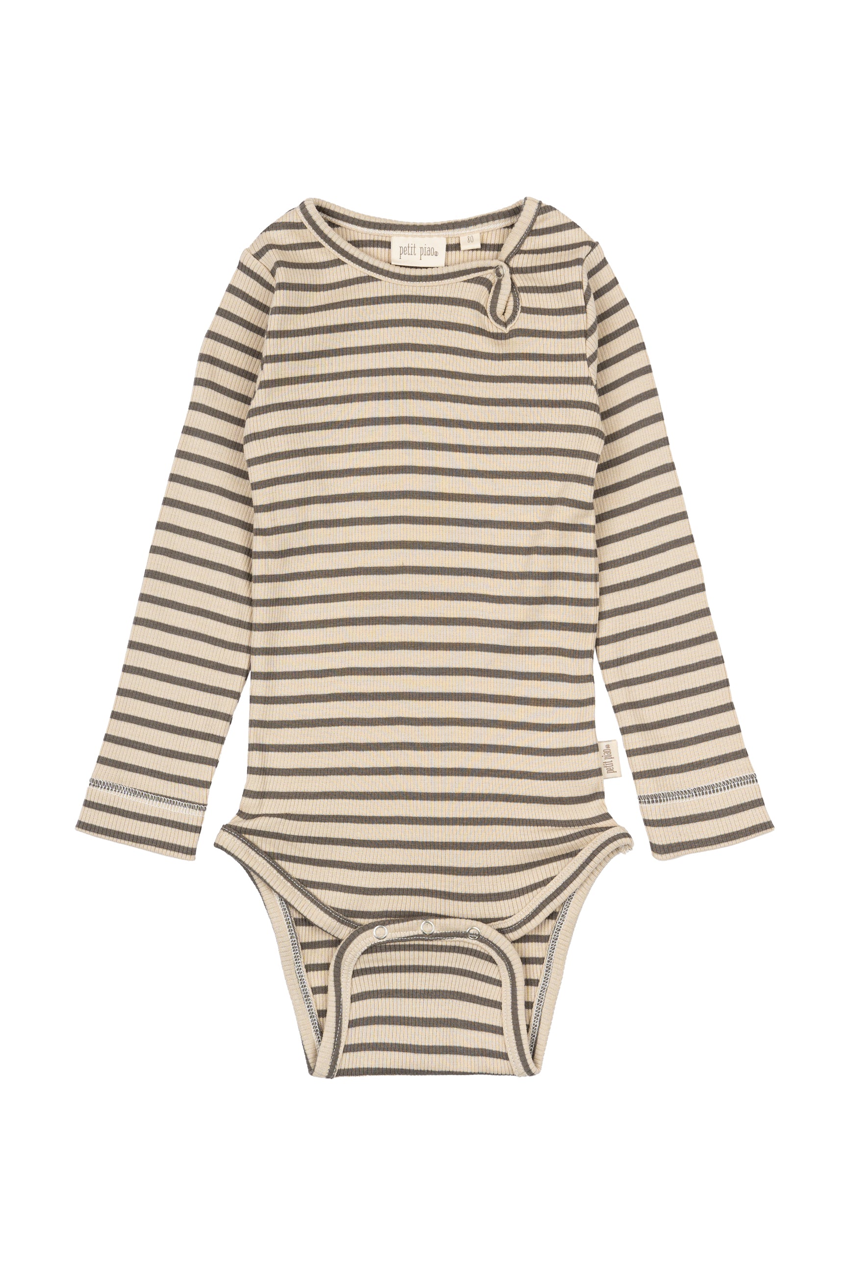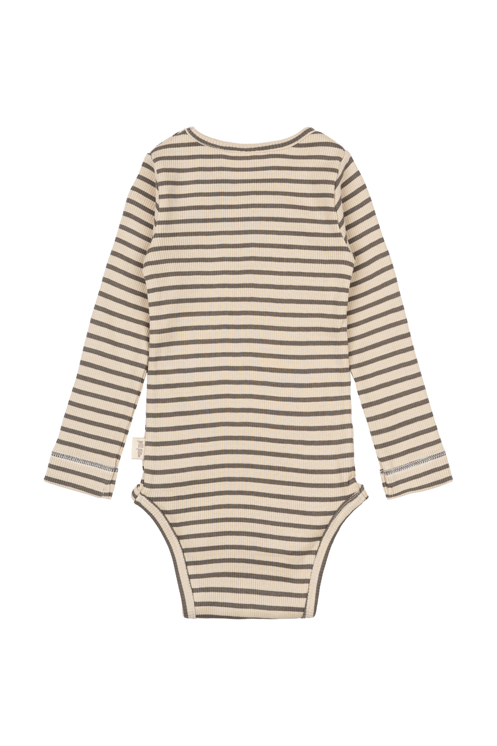 Denne fine stribede body fra Petit Piao i farvekombinationen Earth Brown/Dark Off White er både blød, strækbar og perfekt til hverdagsbrug. Fremstillet i en skøn blanding af 48% bomuld, 48% modal og 4% elastan, hvilket gør den let, åndbar og ekstra behagelig mod huden.