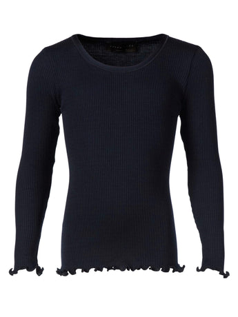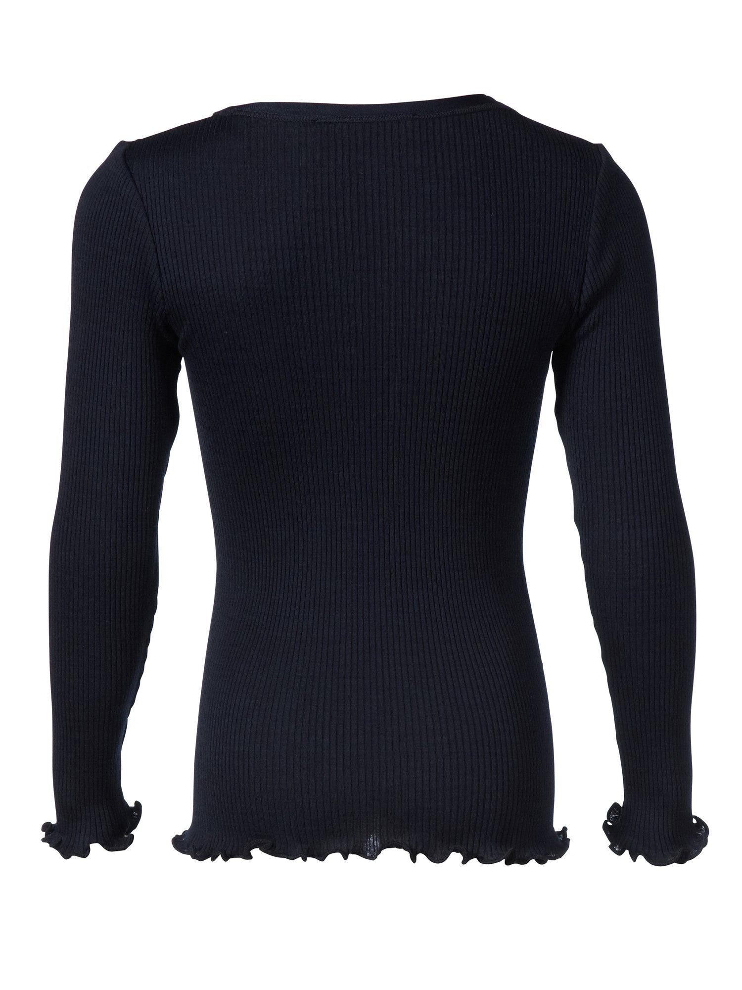 Lækker bluse silke/bomuld i navy fra Rosemunde med sød blondekant i hals. Kombiner den med en matchende silke cardigan for et fint sæt.