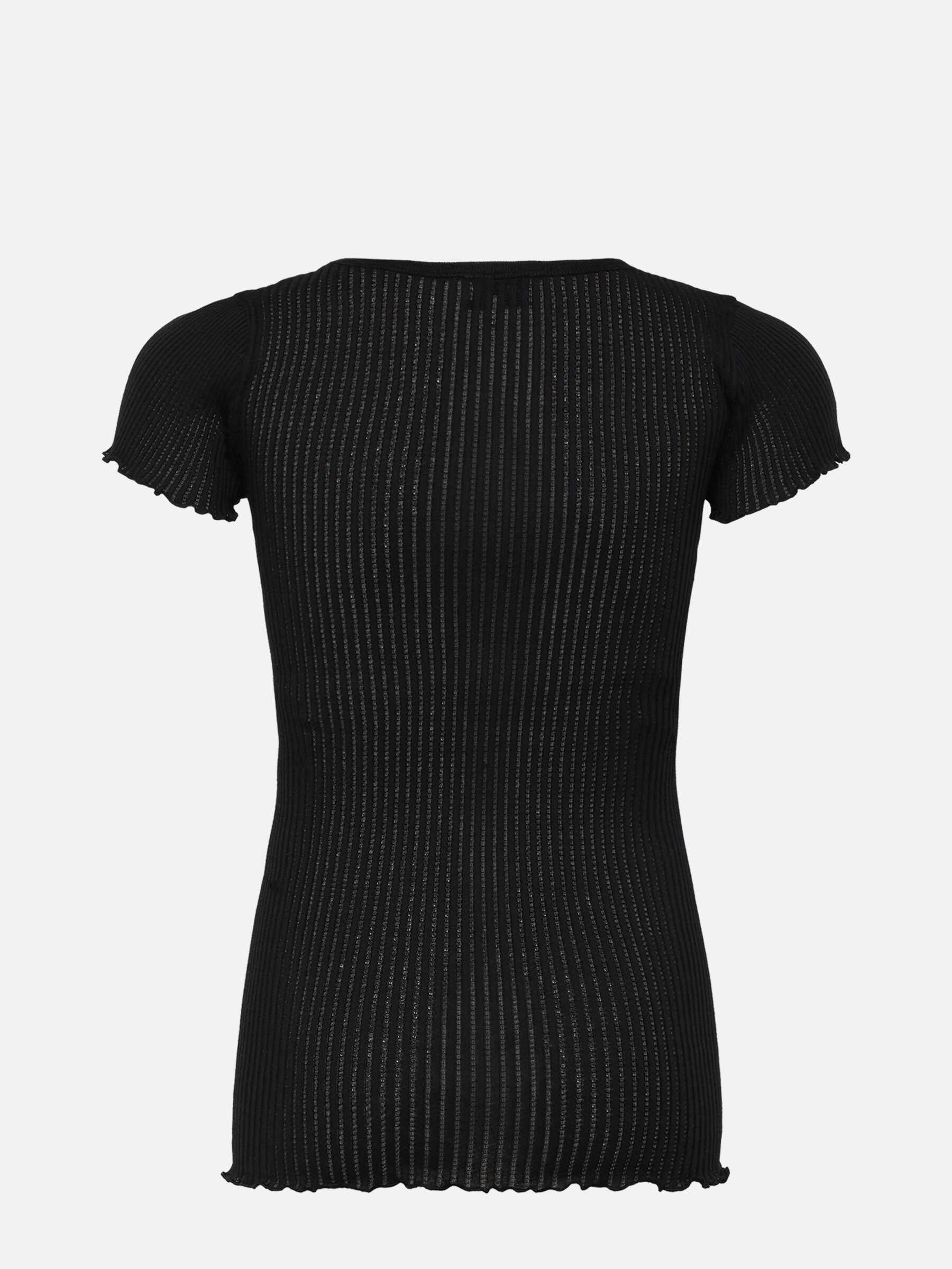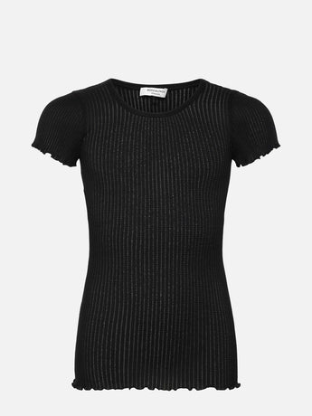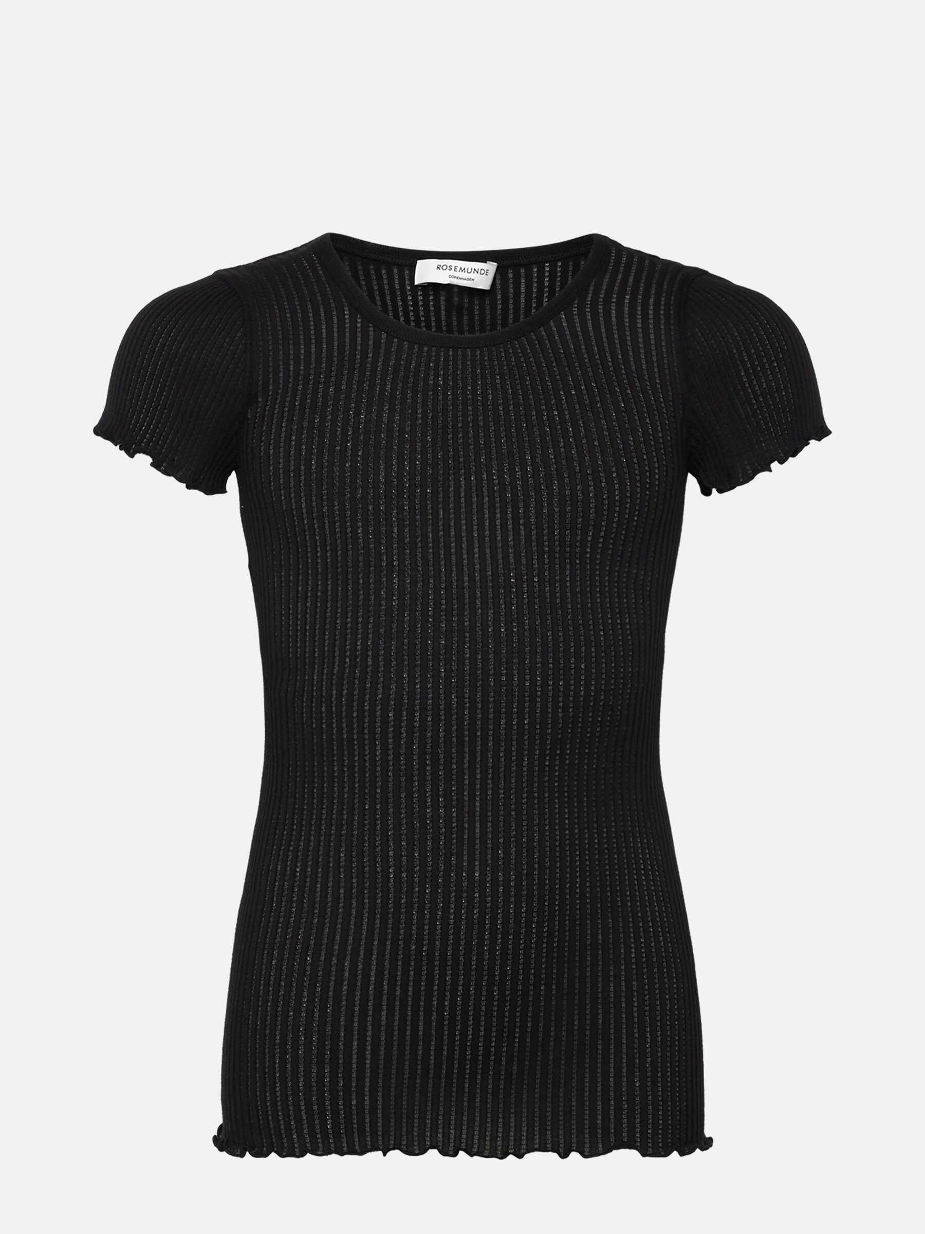 Denne T-shirt fra Rosemunde i farven "Black" er den perfekte kombination af stil og komfort, designet specielt til teens. Denne T-shirt har en rund halsudskæring, korte ærmer og er detaljeret med den karakteristiske krølkant på både ærmerne og forneden, hvilket giver et subtilt, men elegant præg.
