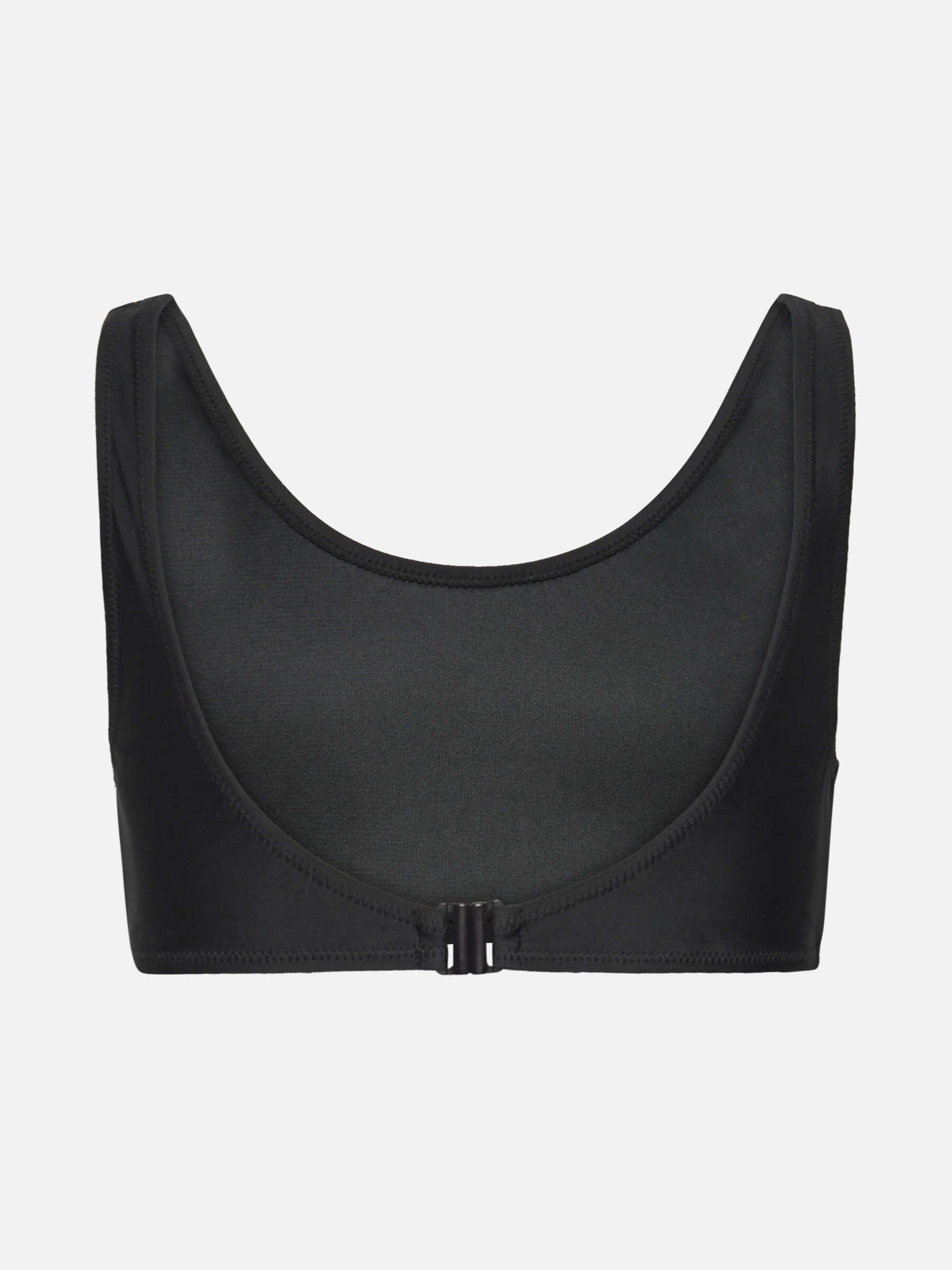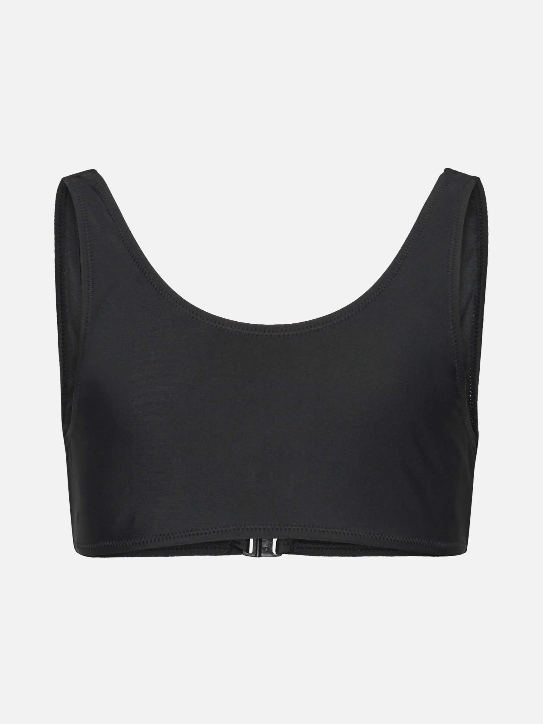 Farven Black giver bikinitoppen et klassisk og tidløst udseende, som er nemt at style sammen med forskellige bikiniunderdele eller shorts. Det stilrene design med den runde udskæring og den funktionelle lukning i ryggen gør den både praktisk og flot.