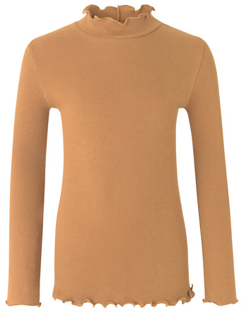 Lækker bluse i silke/bomuld fra Rosemunde i en almond - pæn lysebrun - er utrolig behagelig og former sig efter kroppen - flot med sød rullekant ved hals, i ærmer og for neden.