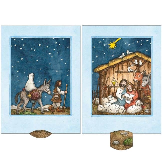 Smukt dobbelt træk ud postkort - Krybbe, der ændrer motivet, når det trækkes. Dette interaktive kort illustrerer rejsen til Betlehem for Maria og Josef, samt øjeblikket efter fødslen af Jesusbarnet i stalden.