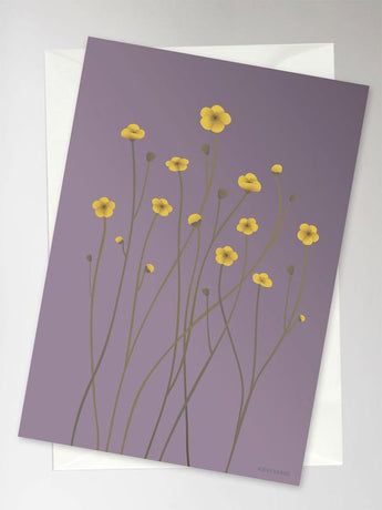 Et virkelig smukt kort, der illustrerer  de uspiselige, solgule smørblomster. Disse vokser ofte i massevis og danner gule blomsterdyner i landskabet, som man kun kan blive i godt humør af at kigge på.