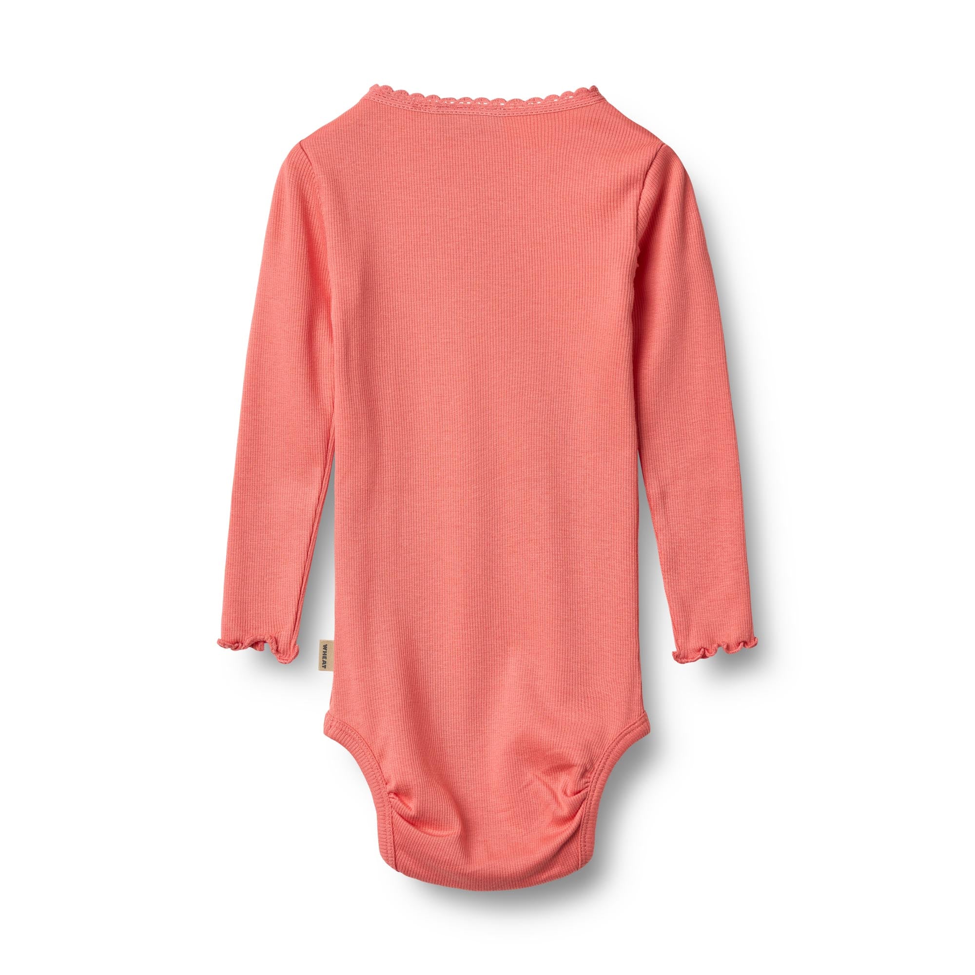 Denne smukke langærmede body kommer med en sød blonde i halsudskæringen, overlocket detalje ved manchetten og læg foran ved hals - så bliver det ikke mere nuttet! Farven hedder "light coral" og er sommerlig som sorbet! Body'en har trykknapper på den ene skulder og i bunden ved benene.